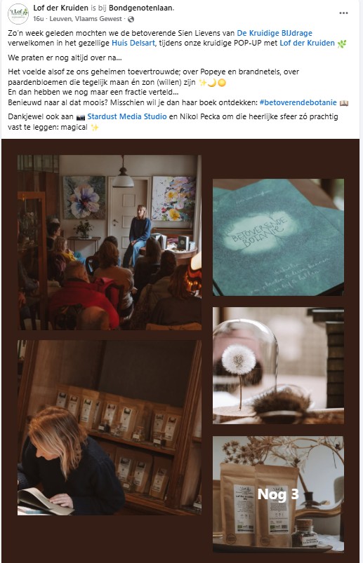 Zondag 1 februari 2026. In het heerlijk naar kruiden geurende Huis Delsart in Leuven mocht ik te gast zijn om mijn verhalen te vertellen. Dat het daar heerlijk naar kruiden geurde, was niet toevallig. Robin van webshop Lof der Kruiden hield er enkele dagen een pop-up om zijn klanten te ontmoeten en te laten meegenieten van alle geuren, smaken en weldaad van losse kruiden, kruidenmengsels, hydrolaten en zoveel meer. Op zijn toog lagen ook heel wat fijne boeken. Dankjewel Robin om er ook Betoverende Botanie een plaatsje te geven!
